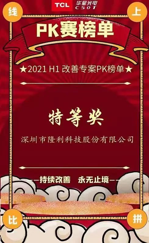 2021819日,在TCL華星隆重召開(kāi)的供應商品質(zhì)改善專(zhuān)案評比大賽上,隆利科技從眾多優(yōu)秀供應商中脫穎而出,以《MCB項目品質(zhì)提升專(zhuān)案》榮獲“特等獎”。這份榮譽(yù)不僅是對公司供貨品質(zhì)保障能力的認可,更是對所有隆利人辛勤工作的褒獎。