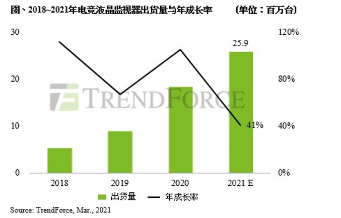 據TrendForce集邦咨詢(xún)發(fā)布的市場(chǎng)數據顯示,2020年電競液晶顯示器(定義為刷新率100Hz以上)出貨量達1840萬(wàn)臺,同比增長(cháng)105%。因“宅經(jīng)濟”需求帶動(dòng),以及各面板企業(yè)和終端企業(yè)的大力推進(jìn),預計2021年成長(cháng)態(tài)勢將會(huì )持續,出貨量可望達2590萬(wàn)臺,年增41%。