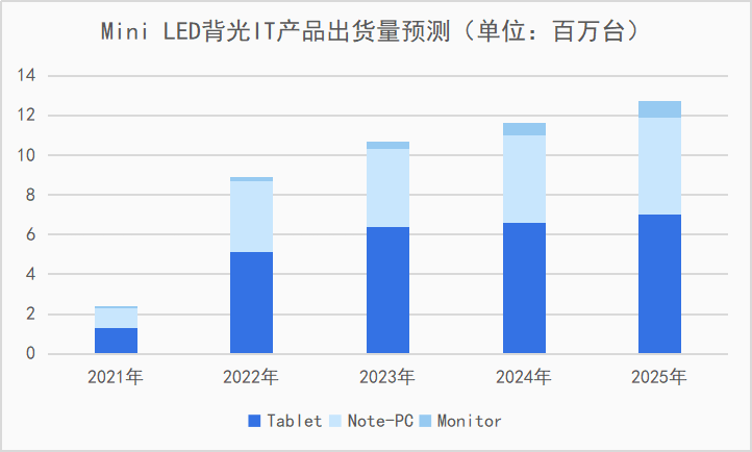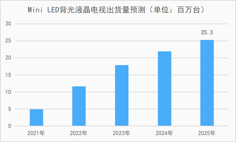 自Mini LED背光液晶產(chǎn)品推出以來(lái)便得到了市場(chǎng)的廣泛認可,更有業(yè)內人士稱(chēng)2021年為Mini LED元年。據市場(chǎng)調研機構Omdia預測,Mini LED背光液晶電視產(chǎn)品未來(lái)發(fā)展迅猛,到2025年出貨量將達2530萬(wàn)臺;同時(shí),應用Mini LED背光的IT產(chǎn)品(包括平板電腦、筆記本電腦、顯示器)出貨量將達1270萬(wàn)臺。